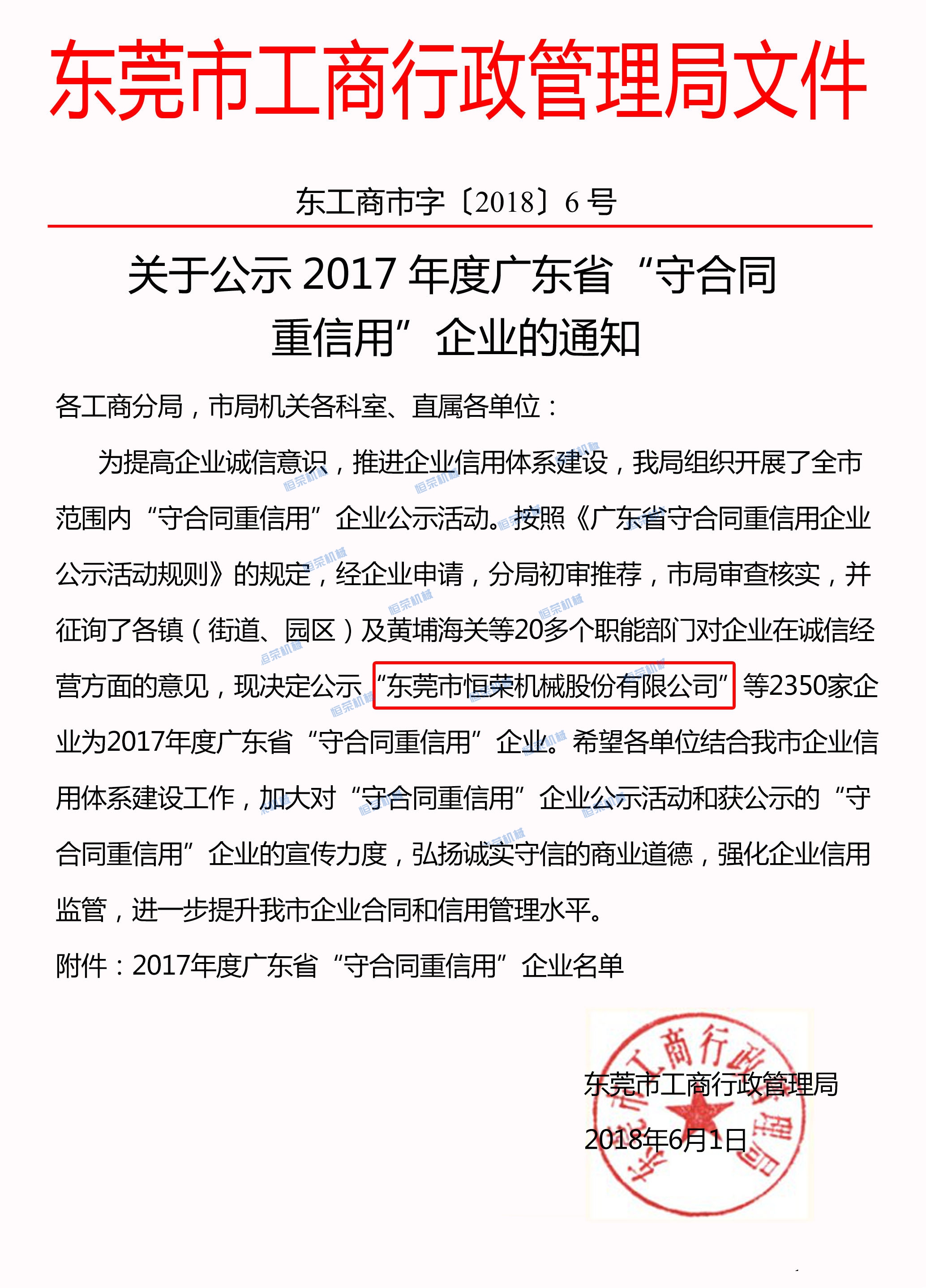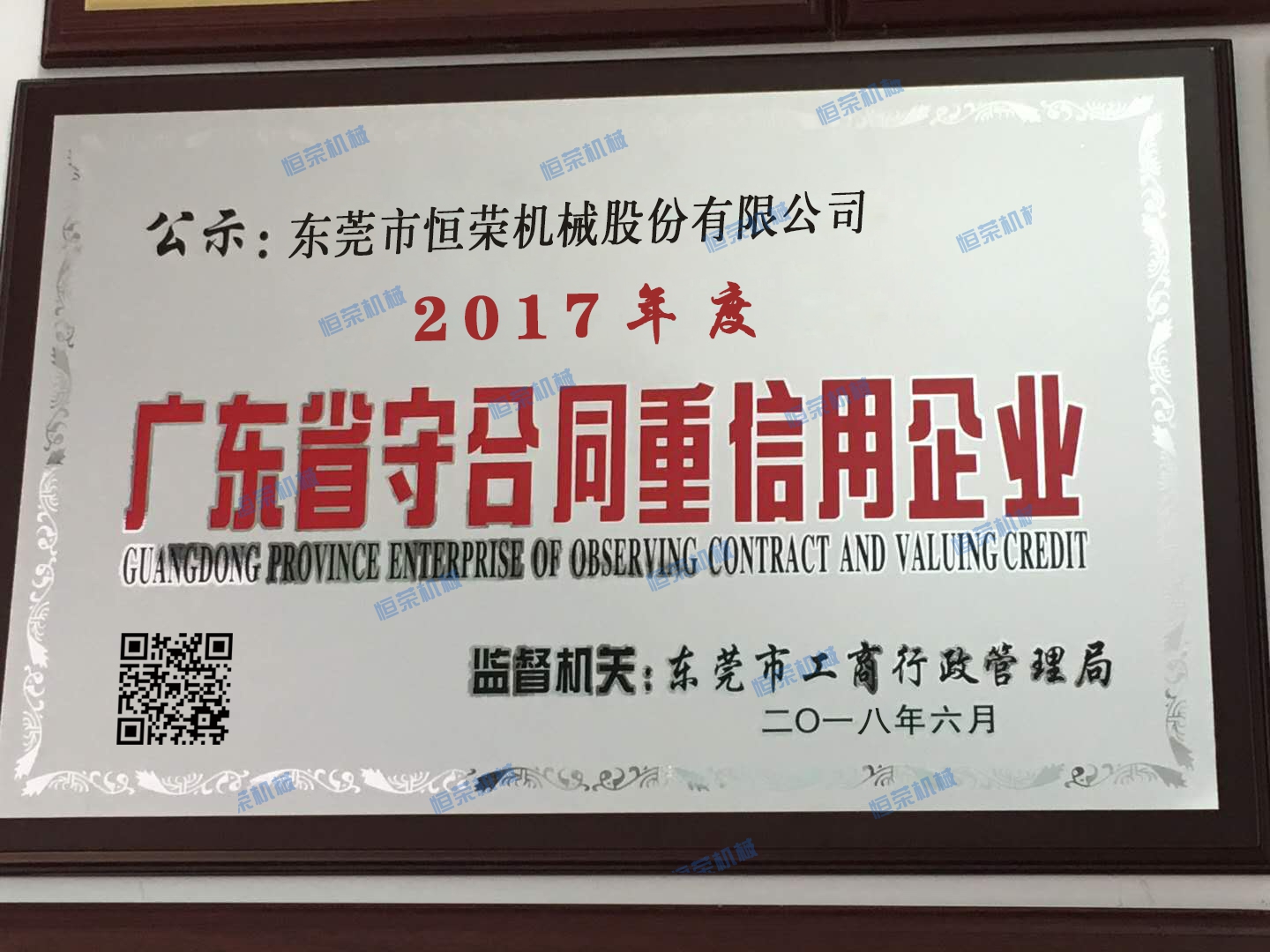 榮獲2017年度東莞市“守合同重信用”企業(yè)稱號,表明了公司誠信建設(shè)得到了政府主管部門和社會各界的高度認可,彰顯了公司誠信立企的核心價值觀,展示了公司重信用的良好形象。