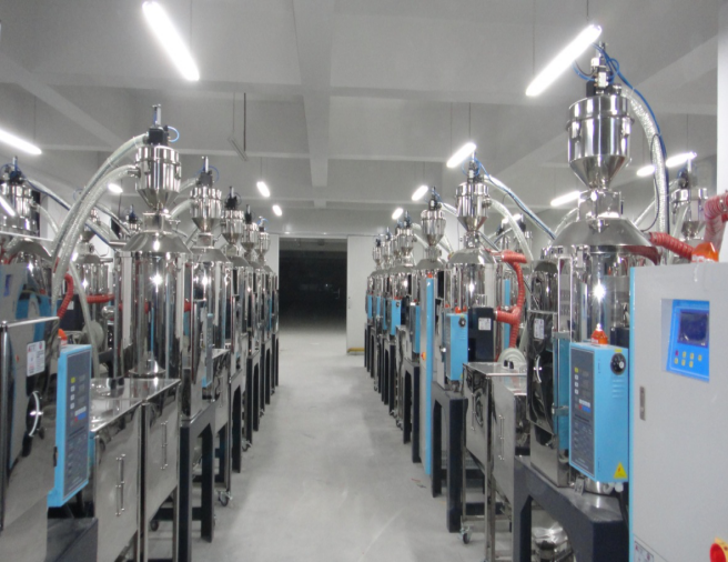 7.中央供料系統采用真空傳送方式,通過集中的管路系統將塑料原料從儲料罐輸送到中央除濕干燥系統,然后將干燥后的原料輸送到每臺注塑機中。